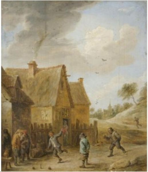 | Rural scene before an inn with boulles players. Circa 1660. | |