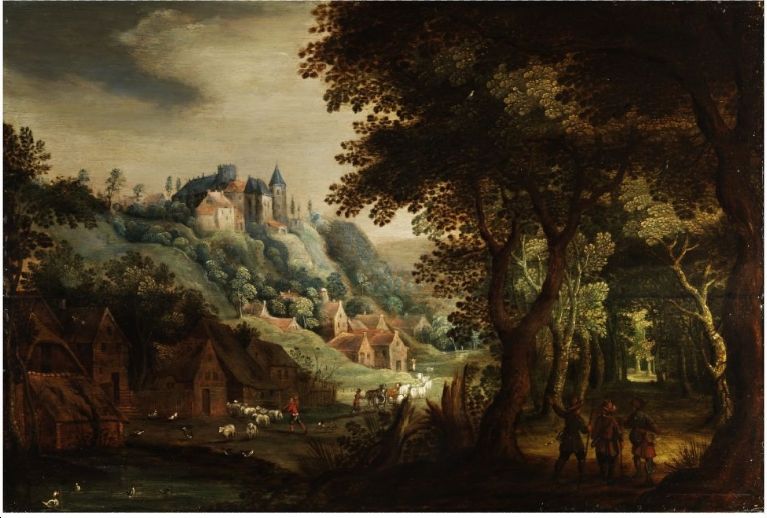 LANDSCHAFT MIT WALDRAND, DORF