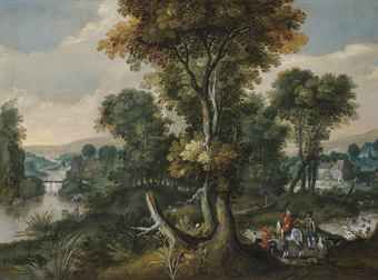 | A wooded river landscape with huntsmen at rest, villagers beyond | |