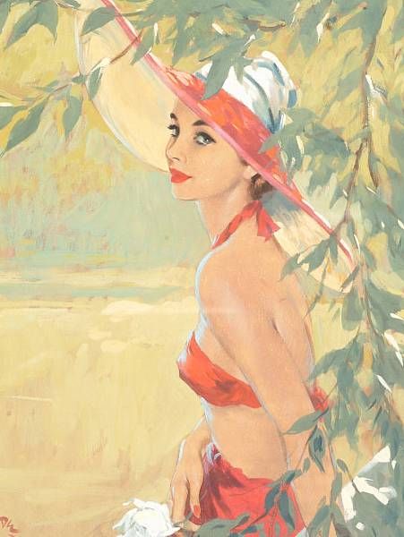 Lady wearing red bikini and sun hat,