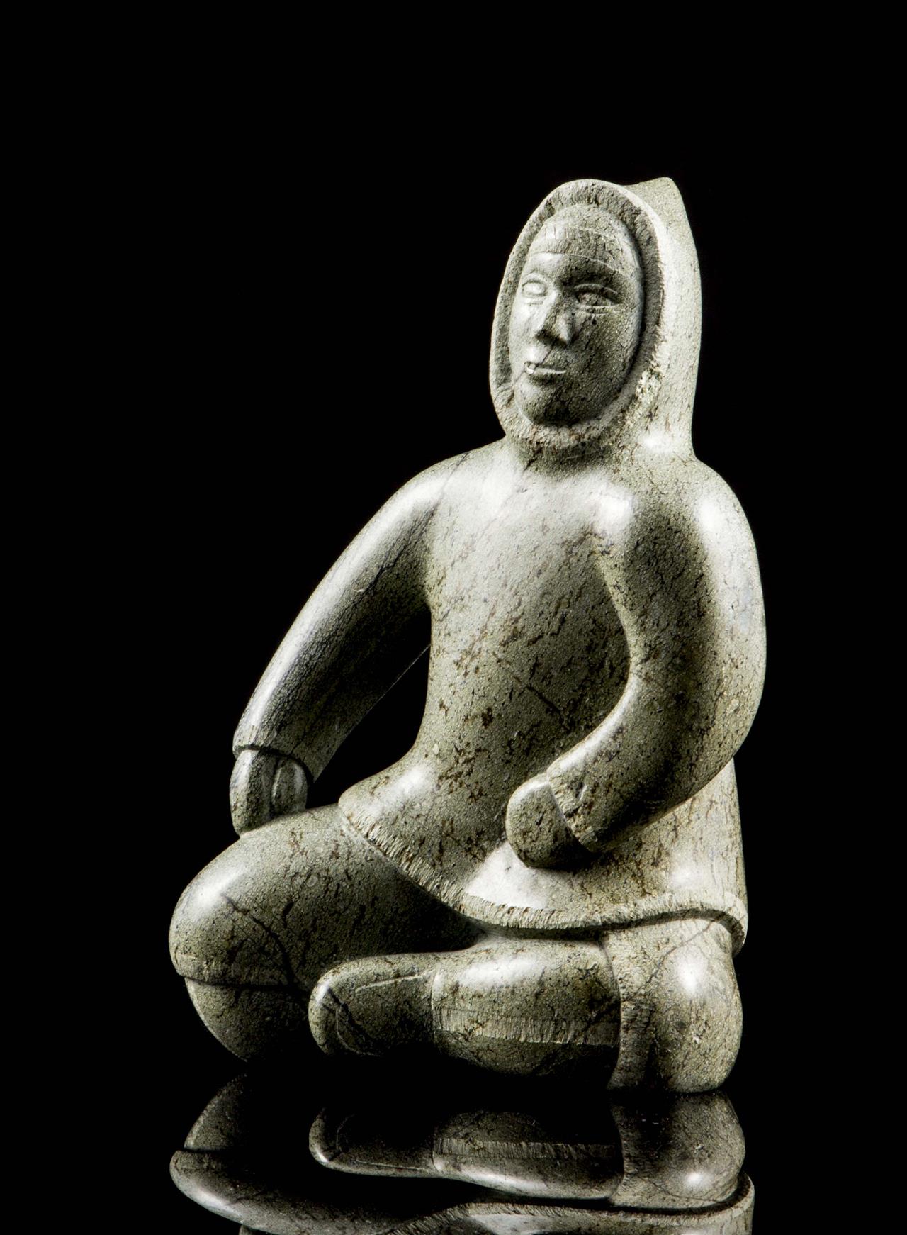 a serpentine carving of a seated Inuk