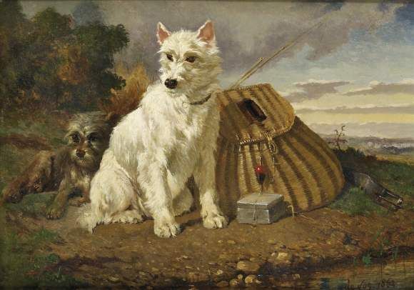 Le chien blanc auprès du panier de pêche