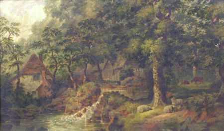 A COTTAGE BESIDE A RIVER WITH SHEEP AND CATTLE