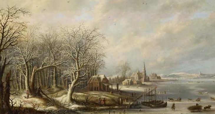 | Weite winterliche Flusslandschaft mit Blick auf eine Hafenstadt. | |