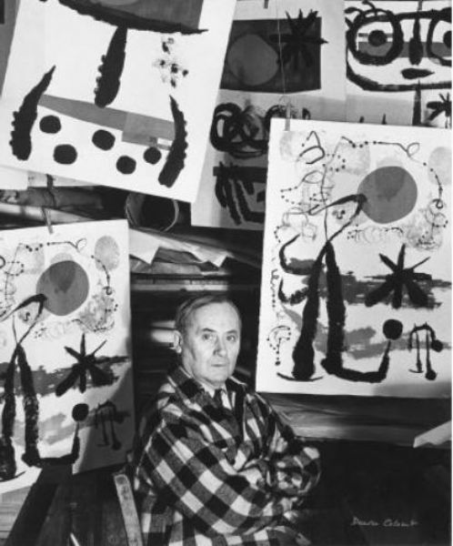 | JOAN MIRO DANS SON ATELIER, ENTOURE DE SES GRAVURES | |