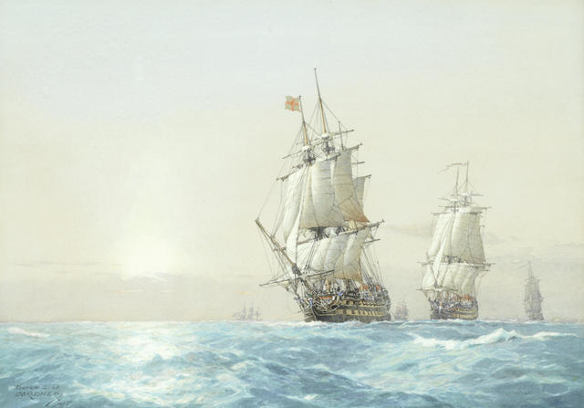 | The 74-gun Superb followed by Powerful and Donegal, with the frigates Acastra and Amethyst in the Atlantic, January 1806 | |