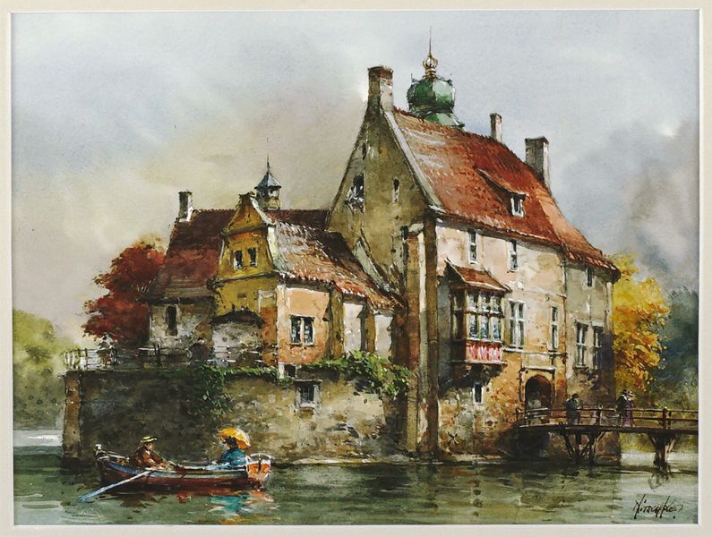 Malerisches Wasserschloss mit Ruderboot und hölzerner Brücke
