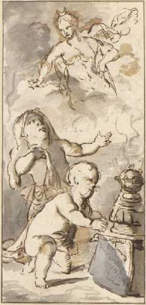 Zwei Putten mit Jagdhund bei einer Dianabüste - Diana mit zwei Putten.