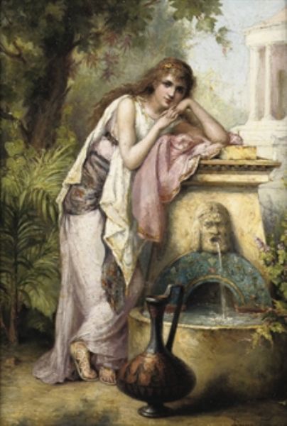 A young beauty by a fountain