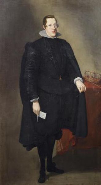| Portrait of King Philip IV of Spain, full-length, in black costume with a crown on a draped table beside him | |