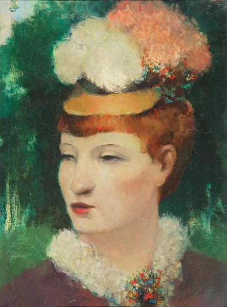 Mädchen mit Federkappe und kurzem Ponyhaarschnitt.