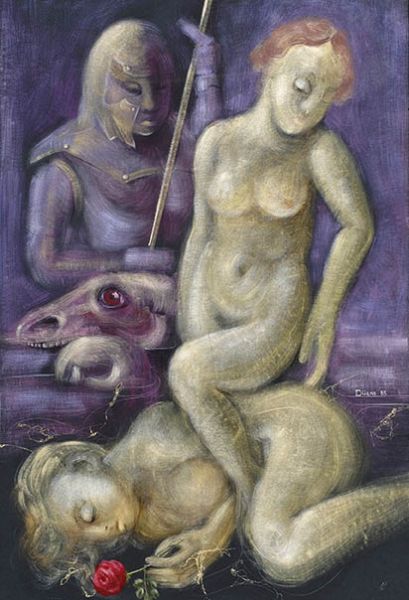 Fantasietafereel met ridder en twee vrouwfiguren