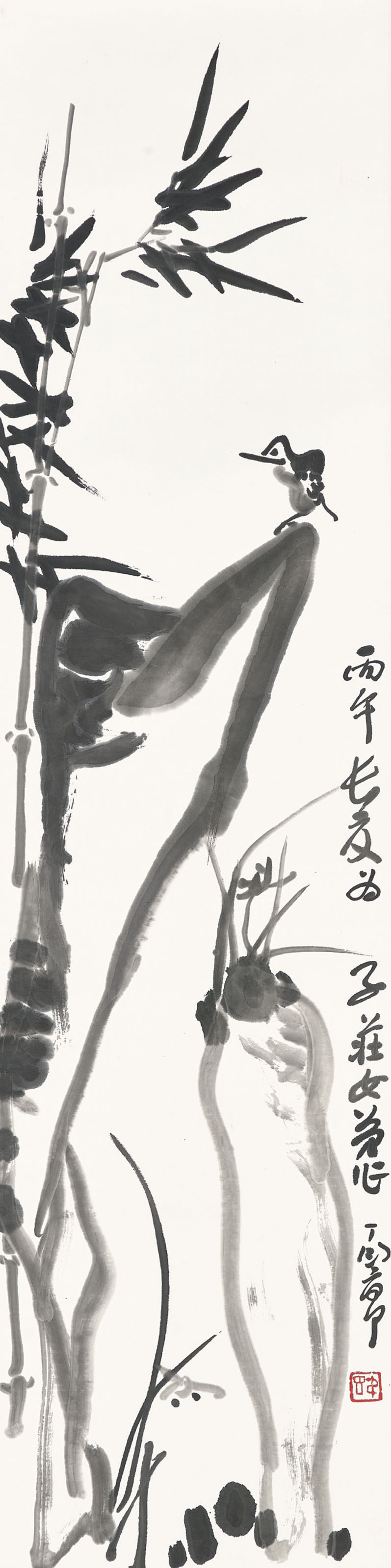 Little Bird on a Rock with Bamboo