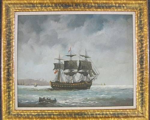 A three masted frigate and boats off a coast