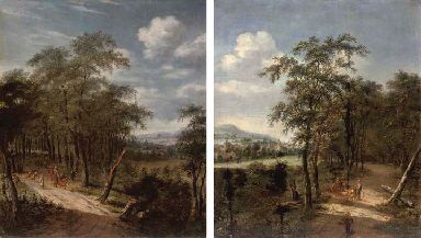 | An extensive wooded landscape with travellers on a path; and A wooded landscape with a family on a path, a church beyond | |