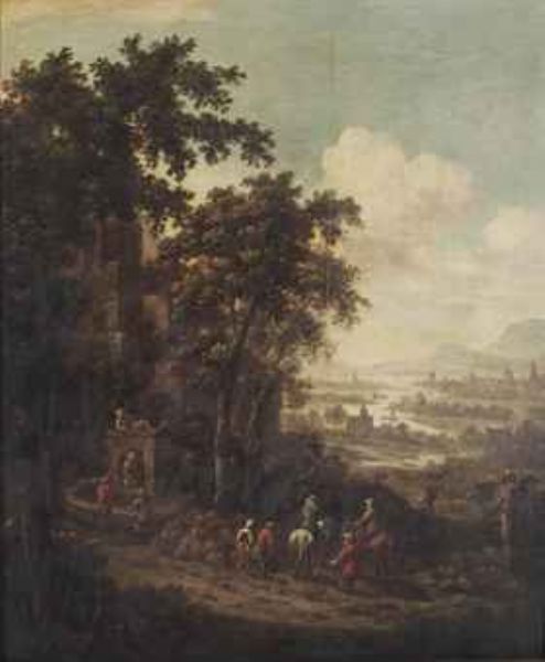 Travellers by a fountain, a river landscape in the distance