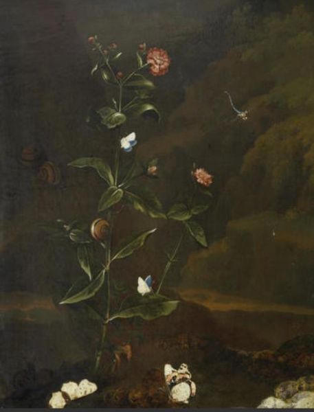| A carnation, Banded snails, a damsel-fly, a Red Admiral and various other butterflies in a forest | |