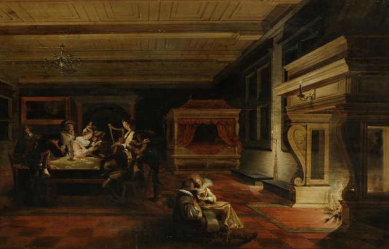 Elegant figures making music and reading in a palace interior