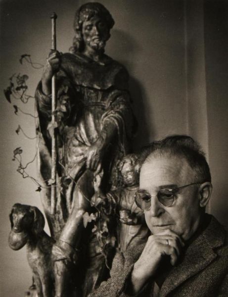 | Gerard Walschap bij een Sint -Rochusbeeld, met studio stempel op de achterzijde | |