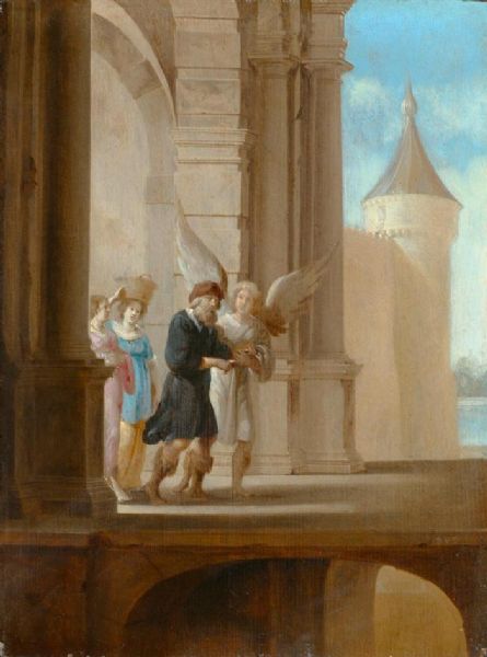 Der blinde Tobias geführt vom Erzengel Raphael.