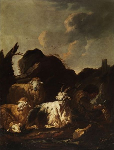 HIRTE MIT SCHAFEN UND EINEM ZIEGENBOCK IN FELSIGER LANDSCHAFT