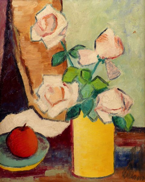 STILL LIFE OF ROSES IN A YELLOW VASE AND A RED APPLE