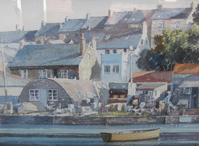 | Houses above Island Street, Salcombe, a tied dingy before nissen hut and the backs of Victorian cottages | |