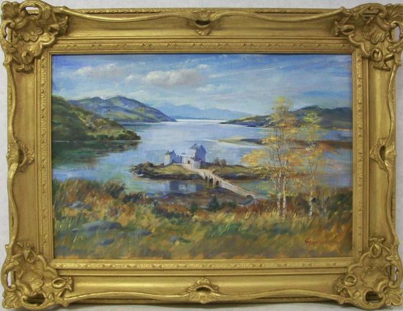 a Scottish loch and glen with a building on an island