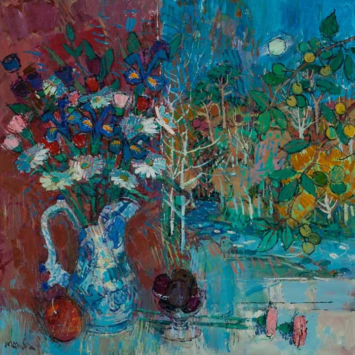 FLOWERS BY A LAZY RIVER, WITH AN AUTUMN MOON