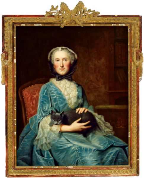 Portrait of a lady in a blue taffeta dress, with a cat in her lap