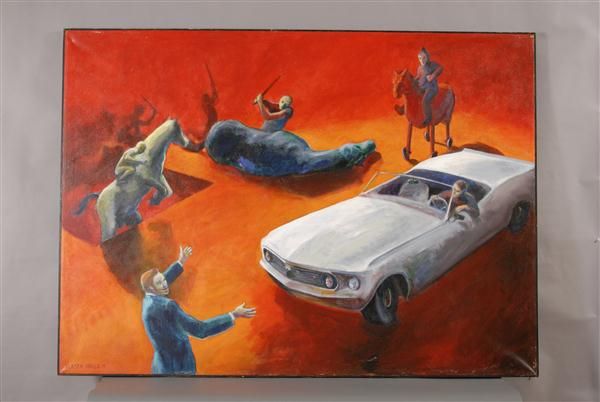 Surreal composition with horses, men and cars