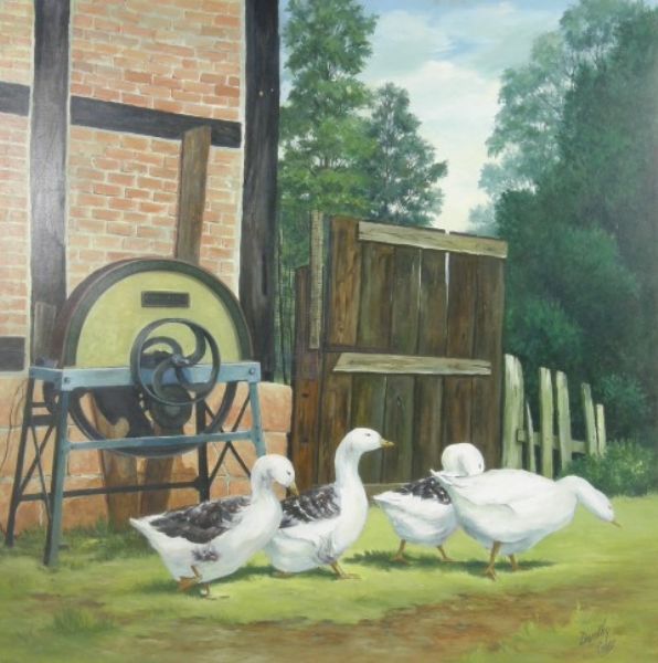 Ducks in a back yard with a sharpening/grinding wheel before a timbered building