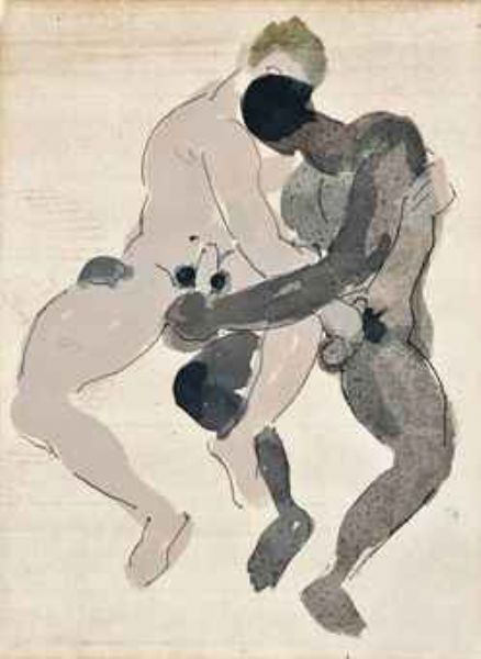 Men embracing; Men wrestling
