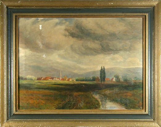 | Weites Tal mit kleiner Stadt, im Hintergrund die Höhenzüge eines Mittelgebirges unter gewittrigem Himmel | |