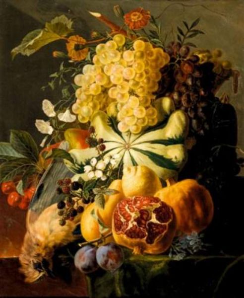 Nature morte aux fruits, fleurs et geai sur un entablement