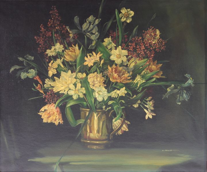 a still life study of spring flowers in a metal mug