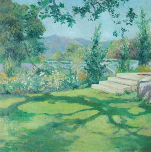 IMPRESSIONISTIC VIEW OF BACKYARD GARDEN WITH FLOWERS