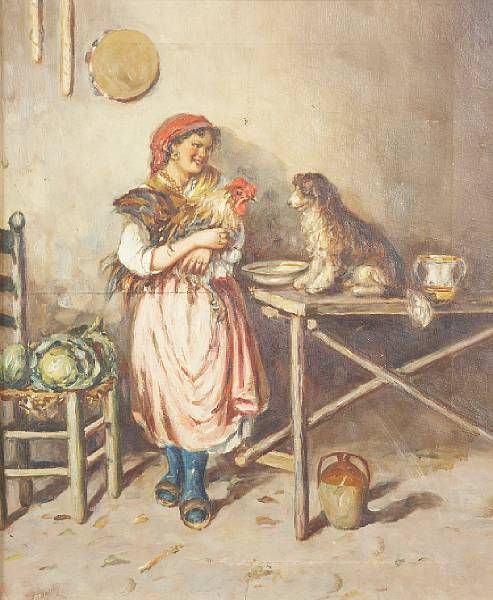 A kitchen interior with a peasant girl, rooster and dog