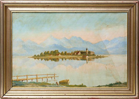 Blick auf die sich im Wasser spiegelnde Insel Frauenchiemsee
