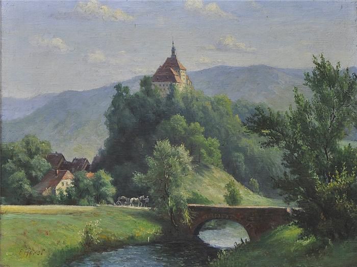 Blick auf Schloss "Wesenstein Müglitztal", so rückseitig auf Keilrahmen betitelt.