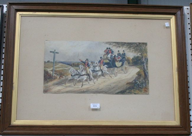 | Coaching Scene with Figures and Sportsmen on a Road passing a Sign inscribed Route de Paris and Route de Versailles within a Fre | |