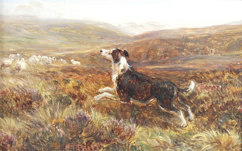 a collie dog with sheep, in a moorland landscape