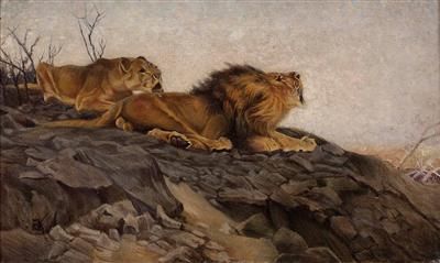 Brüllendes Löwenpaar am Felsen
