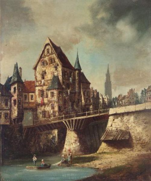 | Häuser einer mittelalterlichen Stadt mit Fachwerkhäusern und Brücke, am Wasser Wäscherinnen und ein Boot | |