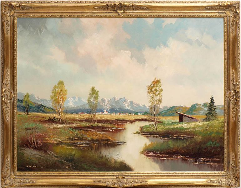 Weite Sumpflandschaft mit kleilnem Dorf, im Hintergrund die verschneiten Höhenzüge der Alpen