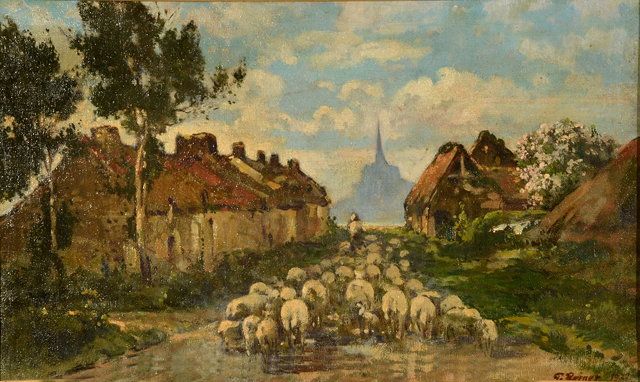 A shepherd with flock of sheep on a roadway lined by cottages and looking towards Mont St. Michel
