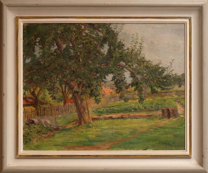 Bauerngarten mit Obstbaum in einem kleinen Dorf