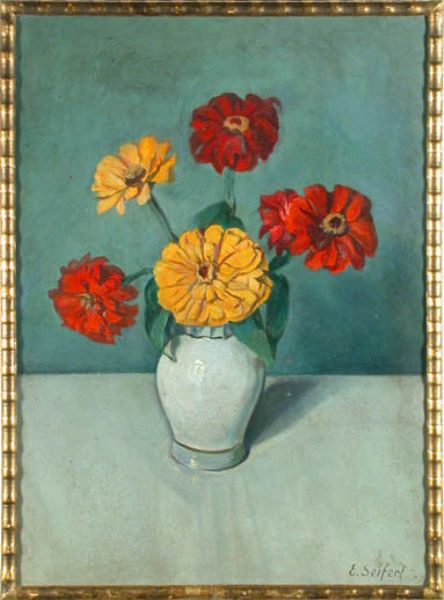 Bauchige Vase mit Zinienstrauß auf hellblauem Tuch