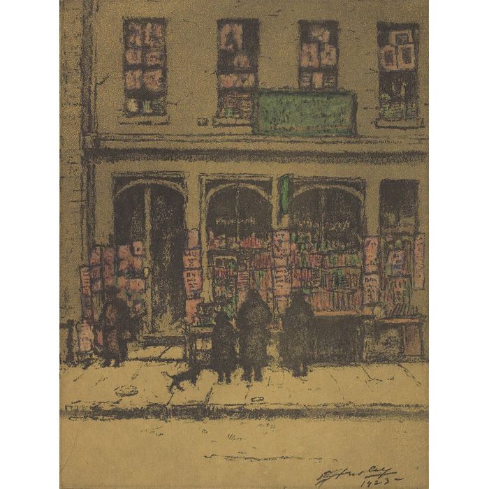 front of a book store with figures