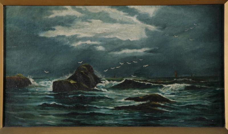 | A MOONLIT SEASCAPE, waves hitting rocks with seagulls flying above | |
